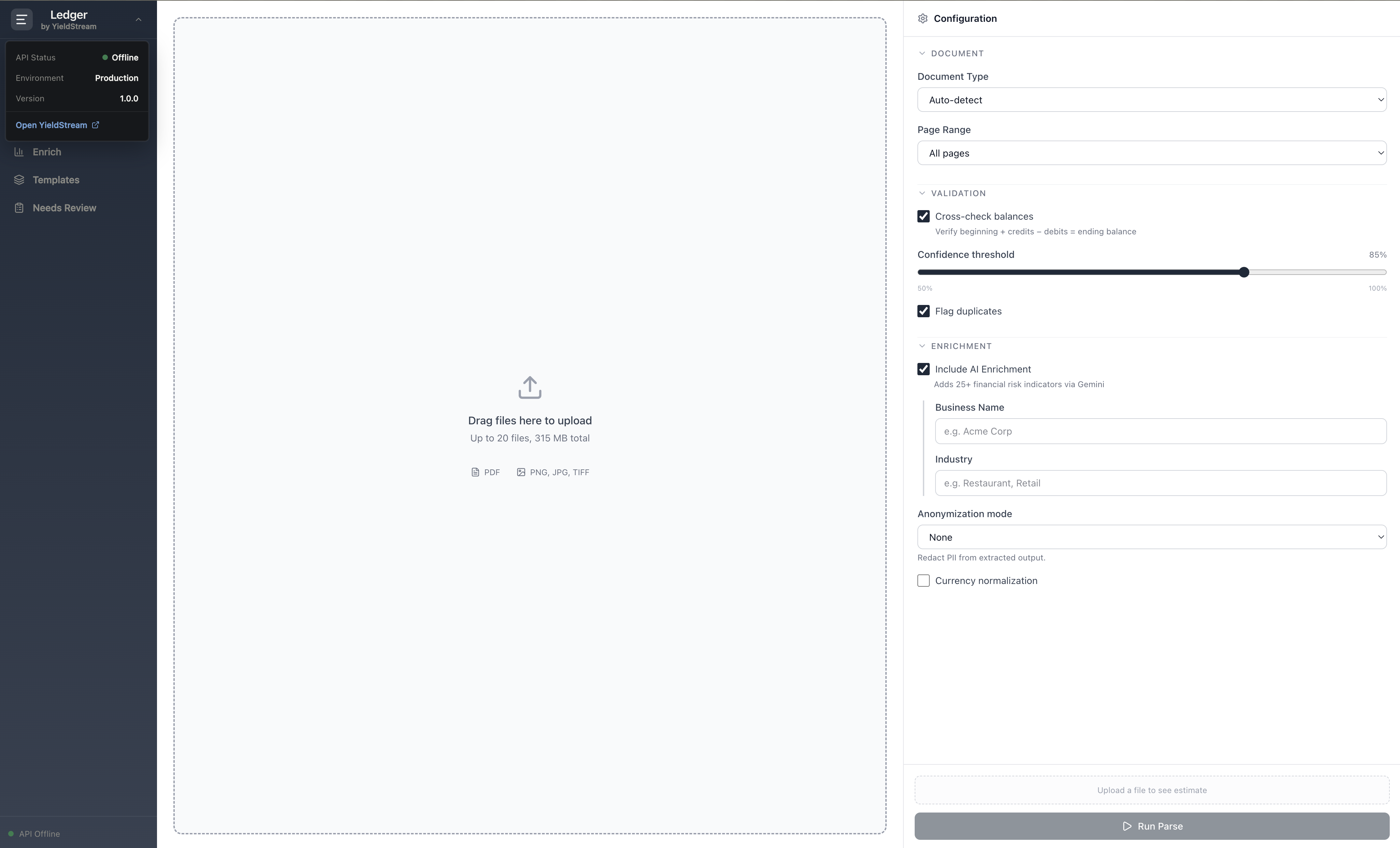 Production document intelligence service for bank statements and tax returns. Multi-tier parsing pipeline, 14 bank templates, 25+ risk indicators, balance reconciliation, and PII redaction — extracted from YieldStream's underwriting platform as a standalone API.