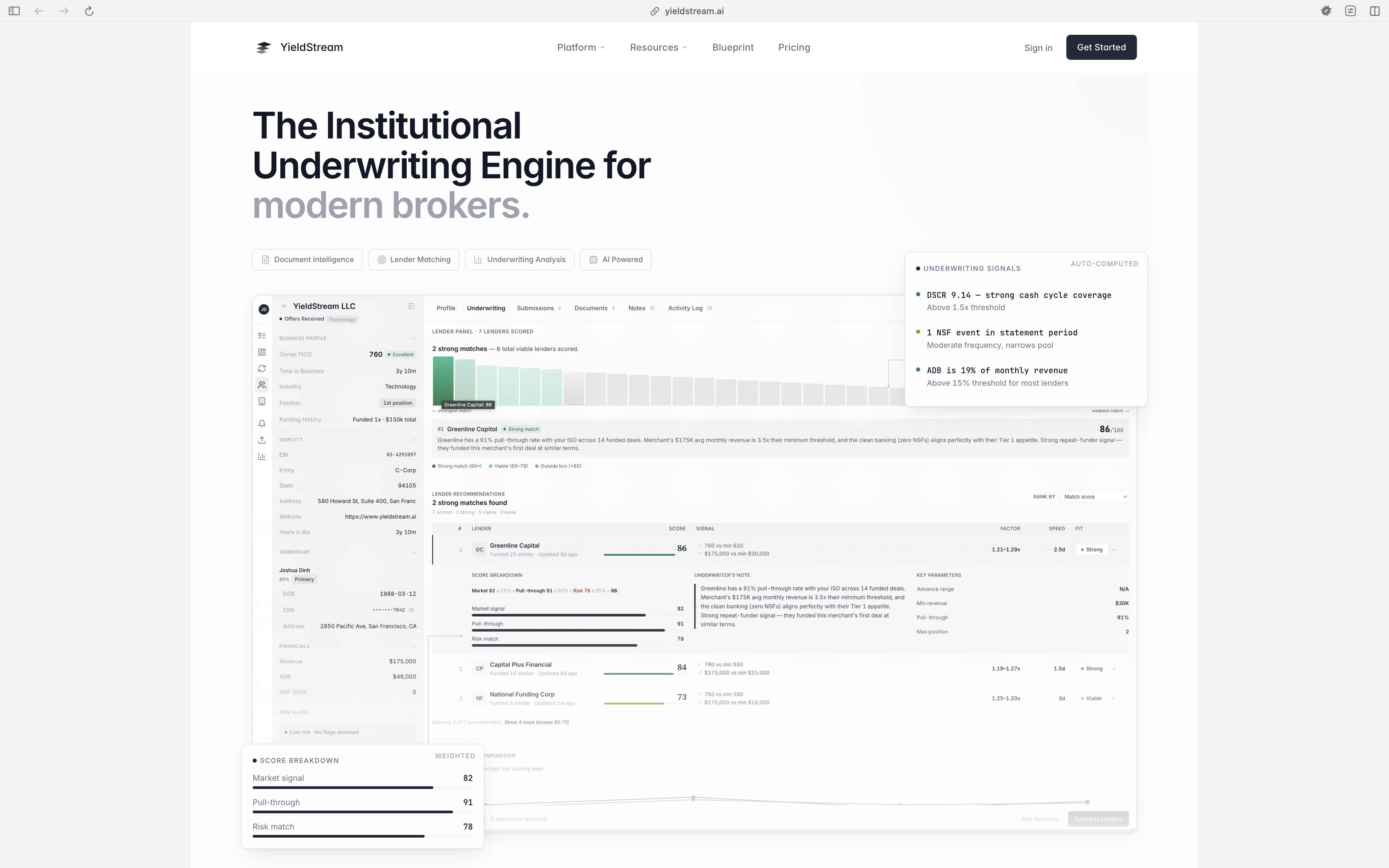 An underwriting platform for MCA brokers. Replaces gut-feel lender routing with data-driven recommendations — combining a three-layer scoring model with AI enrichment and outcome-based learning.